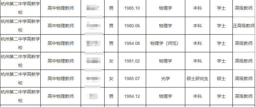 比如,这次杭州第二中学高新学校招了15个高级以上老师,特别是物理学科,全员高级教师,还有一人是正高级,物理学科师资力量雄厚。