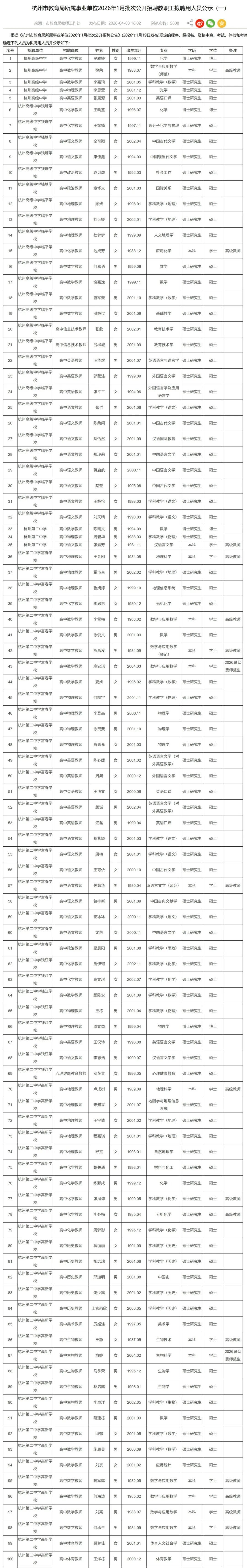 近日,杭州市教育局公示了所属事业单位2026年1月批次公开招聘教职工拟聘用人员,共502人。