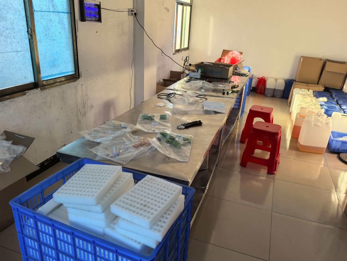 现场环境触目惊心:制假工厂和仓库均藏匿于简陋民房中,墙壁发霉,地面脏污,缺乏基本卫生和消毒条件。装满劣质烟油的塑料桶堆放在墙角,表面布满灰尘和污垢,“工人”们穿着人字拖,甚至有人赤膊上阵进行烟油灌装。在这样的环境中生产出的假冒伪劣产品,不经任何质量检测即流入市场。