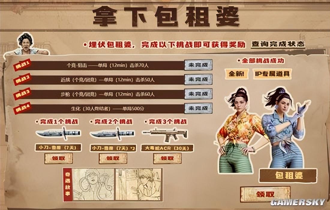 如何验证自己到底是不是FPS高手?此次联动里的“拿下包租婆”活动正合适。玩家需要在个竞-狙击、生化、近战和步枪四个领域,分别完成对应的挑战任务,才能拿到专属奖励。考核的这四项,基本覆盖了CF的主力玩法,颇有挑战性,不少新老玩家跃跃欲试,回归到游戏中,一展自己苦修多年的绝学。